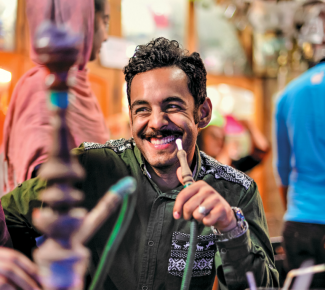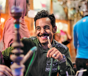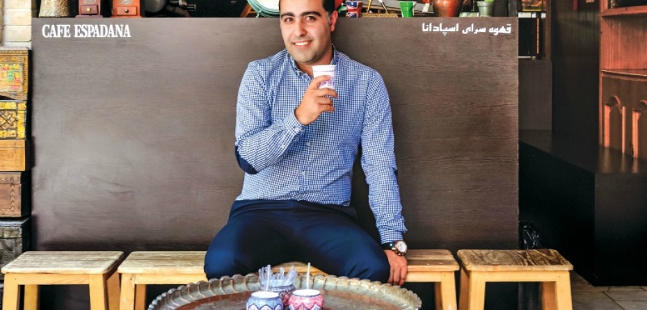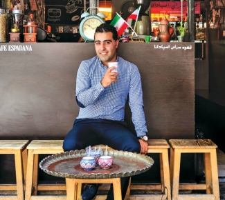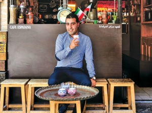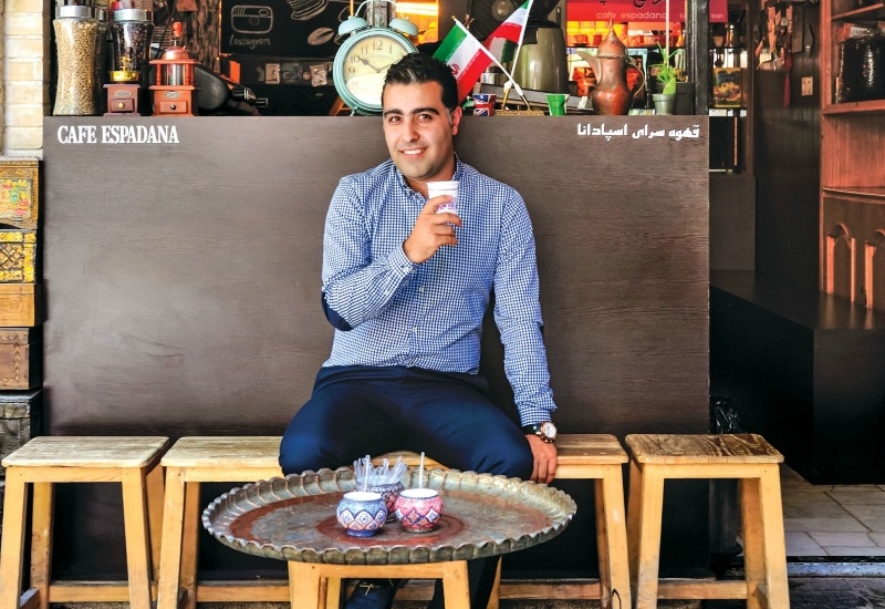 Su turno acaba a las tres de la tarde, y luego podemos ir a dar una vuelta. Nuestro tour cubre lugares como la segunda plaza más grande del mundo, la Meidan-e-Emam, o plazas diminutas y calles angostas en las que encontramos Espedana, donde sirven un gran café, expresos y lattes, para un público joven. Descubrimos cafés escondidos, excéntricos, como el Qeysarieh Tea Shop, donde los iraníes van a fumar shisha, a tomar doogh (como un suero de leche con menta seca) o jugo de zanahoria y té con pastelitos.