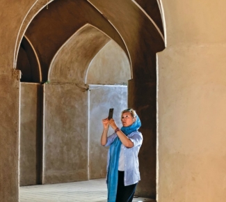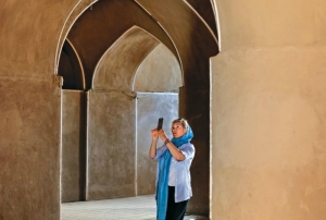 Es increíble deambular por el enredado laberinto de adobe de Kermán, sumergiéndote en espacios abovedados, frescos y después subir una escalera para disfrutar del paisaje, que en invierno e incluso en primavera consiste en cimas de altas montañas, adornadas de manera elegante por nieve. En esta ocasión, un grupo de niñas risueñas quisieron salir en nuestras fotos. Selfies grupales, manos al aire y grandes sonrisas para la cámara y un intercambio de cuentas de Instagram que es lo que usan aquí, pues no hay Facebook, a menos que uno sepa cambiar su VPN.