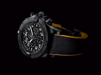 Movimiento mecánico automático, 50 mm, caja negra ultra ligera, calibre Breitling B12, reserva de marcha de 70 horas y correa en caucho.